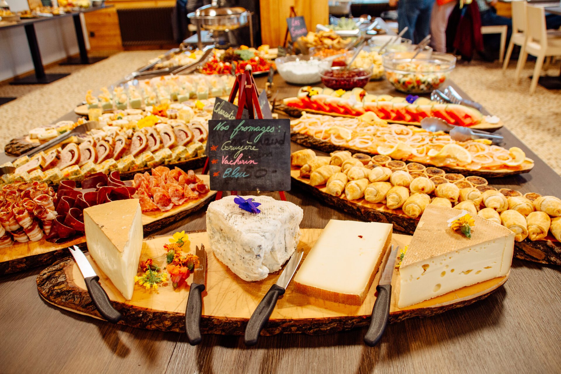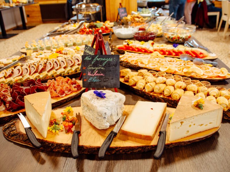 On the menu: fruit juice, bread and pastries, an assortment of cold meats and local cheeses, a variety of salads, savoury tarts, hot and cold dishes from the Chef, from here and elsewhere…